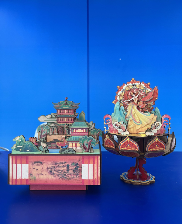 三件作品均根植于湖北地域文化,注重传统与现代的有机结合。“江汉揽胜图书立”以明代名画《江汉揽胜图》为灵感,通过木质立体书立的形式,再现武汉历史景观;“凤舞音乐盒”源于2025年央视春晚“武汉六分钟”节目相关设计,融入楚风意象;“云梦风景盒”则以云梦睡虎地秦简为文化原点,融合梦泽山水与地域建筑元素,将历史底蕴转化为具有现代美感的文创摆件。其中,“云梦风景盒”曾获首届“汉字文化周·楚天杯”全国大学生汉字文化创意设计大赛二等奖。